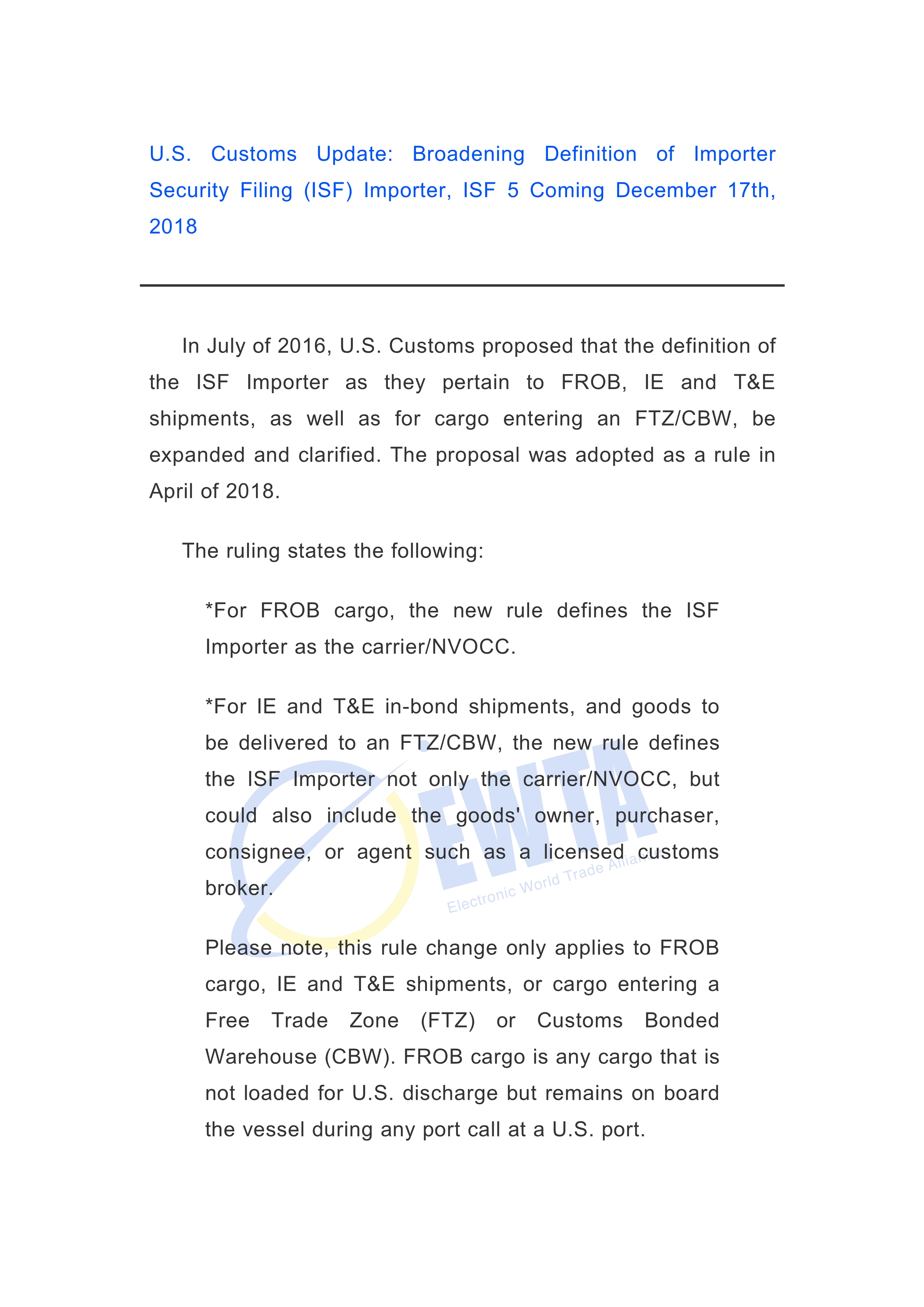 近日,美國海關(guān)對ISF(Importer Security Filing,即進口安全申報))申報主體給出新的定義,2018年12月17日正式生效,這或?qū)⒏淖儸F(xiàn)有海關(guān)申報模式!